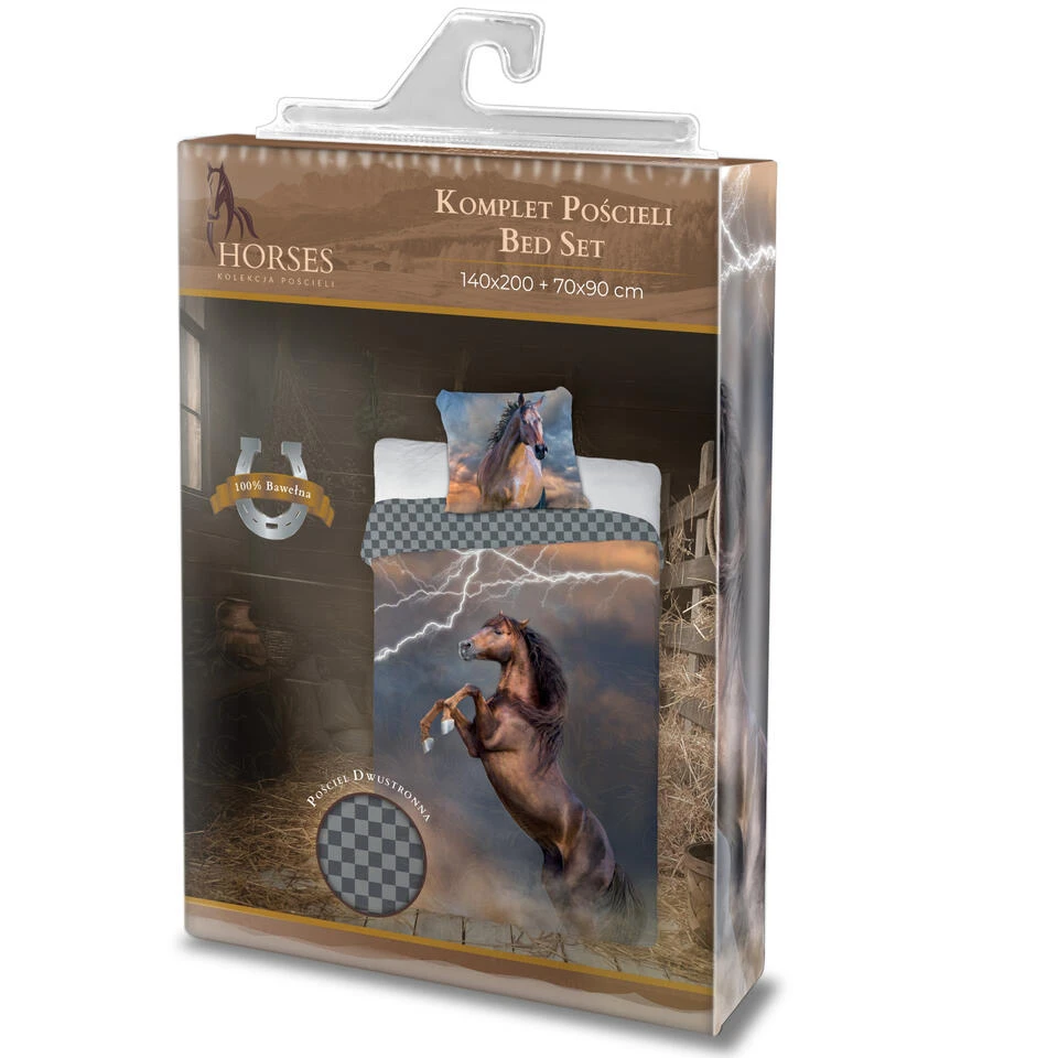 Animal Pictures Dekbedovertrek, Lightning. Een mooi katoenen dekbedovertrek van een steigerend paard. Op de achtergrond zie je een bliksemschicht. Dat is nog eens een krachtig beeld! Mooi voor op elke slaapkamer en een musthave voor elke paardenliefhebber. De achterzijde van het overtrek is voorzien van een ruitpatroon, wat een leuk effect geeft als je het dekbed een stukje openslaat bij het opmaken. Samen met het extra grote kussensloop heb je een echte blikvanger in huis en een geweldig cadeau-idee voor elke fan van paarden!