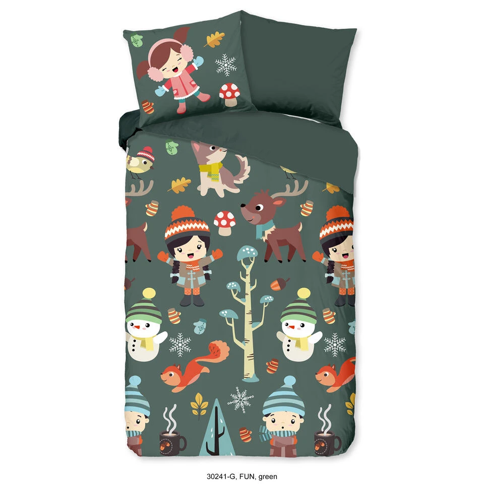 Dekbedovertrek “Fun” van Good Morning met winterthema, in de kleur “Groen” is gemaakt van 100% Cotton. Deze kwaliteit is ademend, vocht absorberend en voelt zacht en soepel aan.