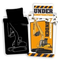 Graafmachine Dekbedovertrek, Glow in the Dark. Mooi eenpersoons katoenen dekbedovertrek met een bijzondere print van een stoere graafmachine. De graafmachine gloeit na in het donker! Als er genoeg licht op schijnt geeft dit dekbedovertrek enige tijd licht in het donker.