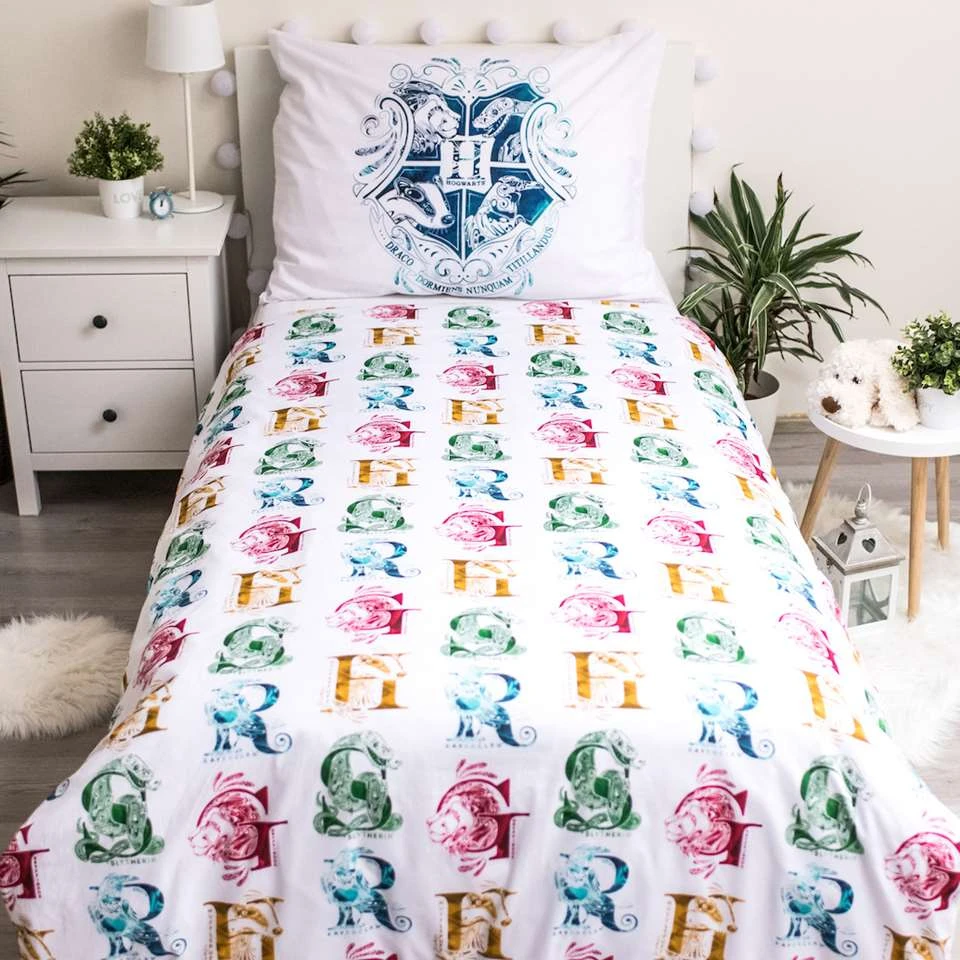 Harry Potter Dekbedovertrek. Een stoer katoenen dekbedovertrek van Harry Potter met het logo van de tovenaarsschool Zweinstein. Op de achterkant zijn de letters van de vier afdelingen van deze school in kleur gedrukt. Dit geeft een leuk effect bij het opmaken van het bed. Wordt geleverd met extra grote kussensloop. Er is tevens een bijpassend hoeslaken apart te bestellen. Een leuk cadeau idee voor de feestdagen of een verjaardag.