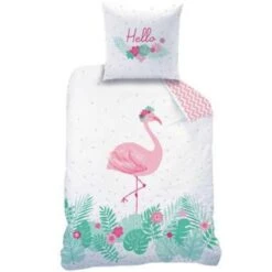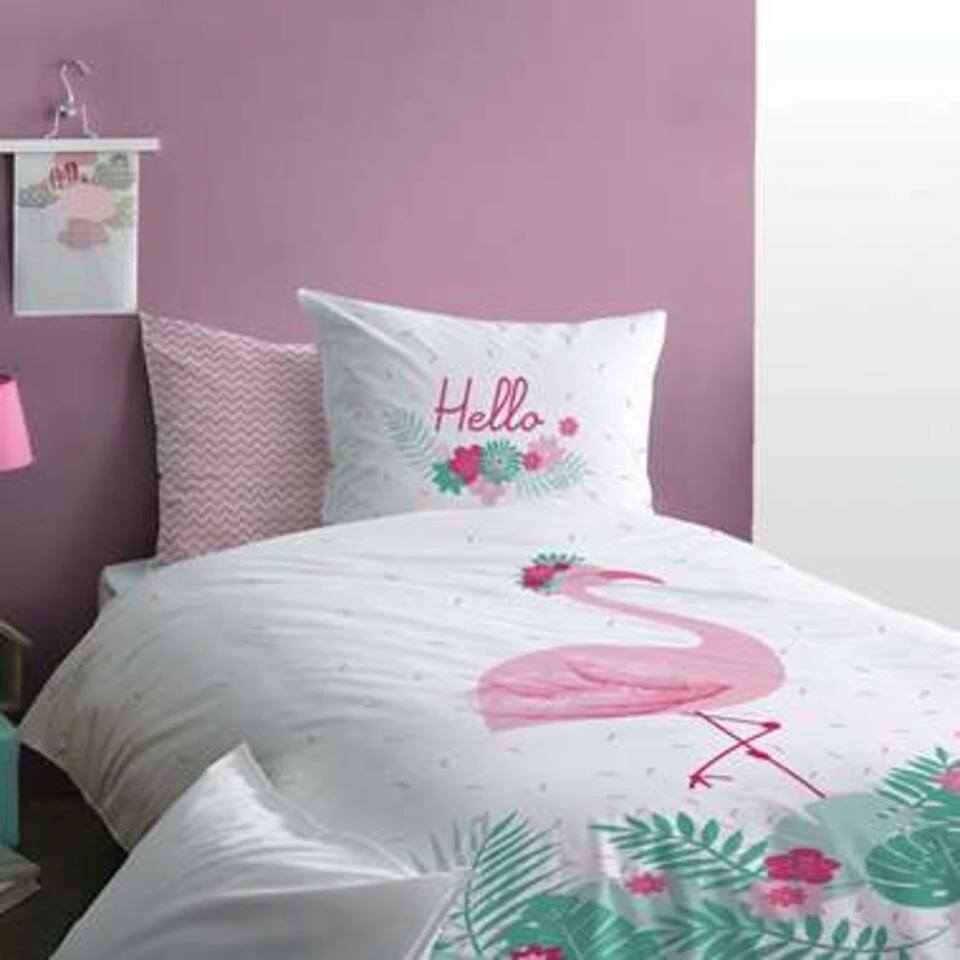 Matt & Rose Dekbedovertrek Flamingo rose. Mooi en vrolijk eenpersoons dekbedovertrek van 100% katoen. Op de bovenzijde is een flamingo afgebeeld met een bloemenkrans op het hoofd, op de witte achtergrond is roze confetti en bladeren en bloemenprint aan de onderkant. De binnenzijde heeft een wit zigzag patroon op een licht roze achtergrond.