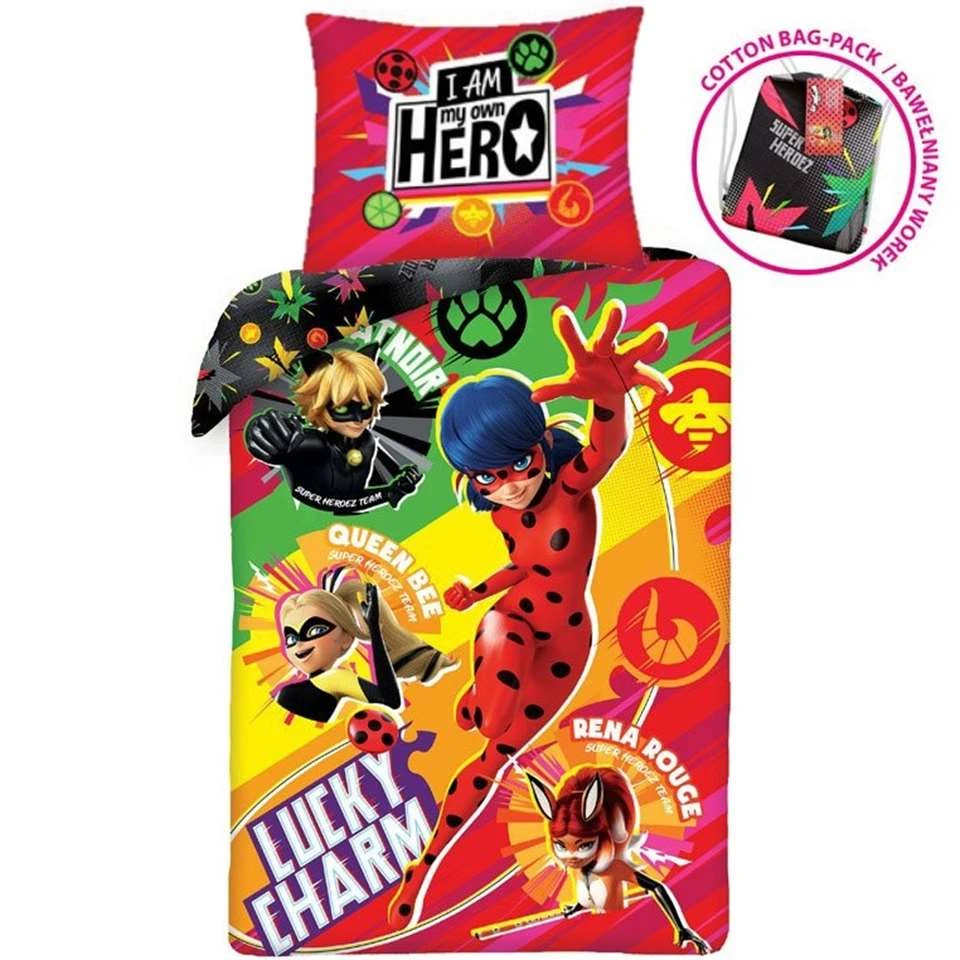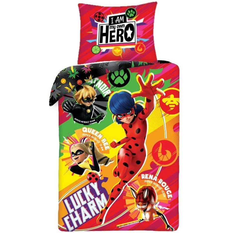 Miraculous Ladybug Dekbedovertrek, Lucky Charm. Eenpersoons katoenen dekbedovertrek met een kleurrijke print van helden Miraculous Ladybug en haar vrienden. Het dekbedovertrek is tweezijdig bedrukt en wordt geleverd met een extra groot kussensloop en een handig pyjamatasje. Een geweldig cadeau om te geven!