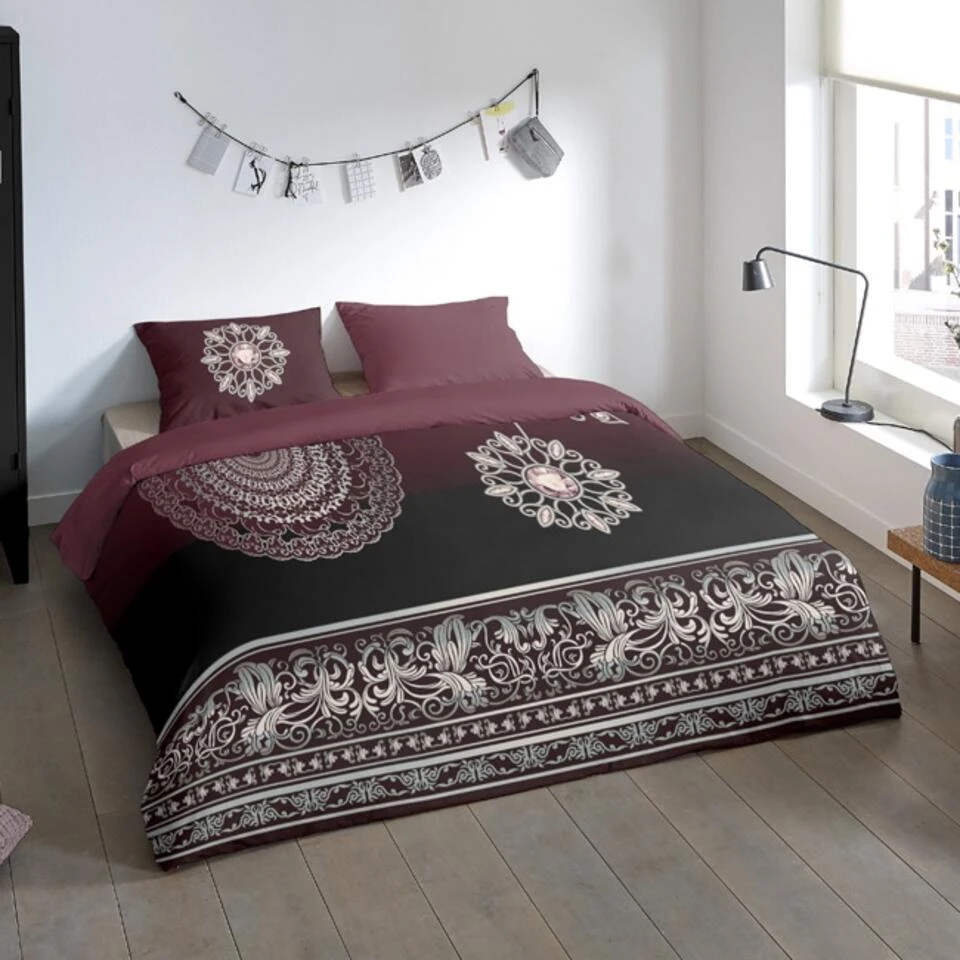 Dekbedovertrek “Asiya” van Pure met mandala’s, in de kleur “Bordeaux” is gemaakt van 100% Microfiber. Het is een prettige stof, gemaakt van synthetische garen maar vergelijkbaar met het natuurlijke materiaal katoen, doordat het zacht en soepel aanvoelt. Het is geschikt voor ieder jaargetijde en door de lichte glans heeft het een luxe uitstraling. Na het wassen is deze stof snel droog en kreukt niet tot nauwelijks waardoor strijken (vrijwel) niet nodig is. Ook beschermt het tegen bacteri’n, vuil en huisstofmijt